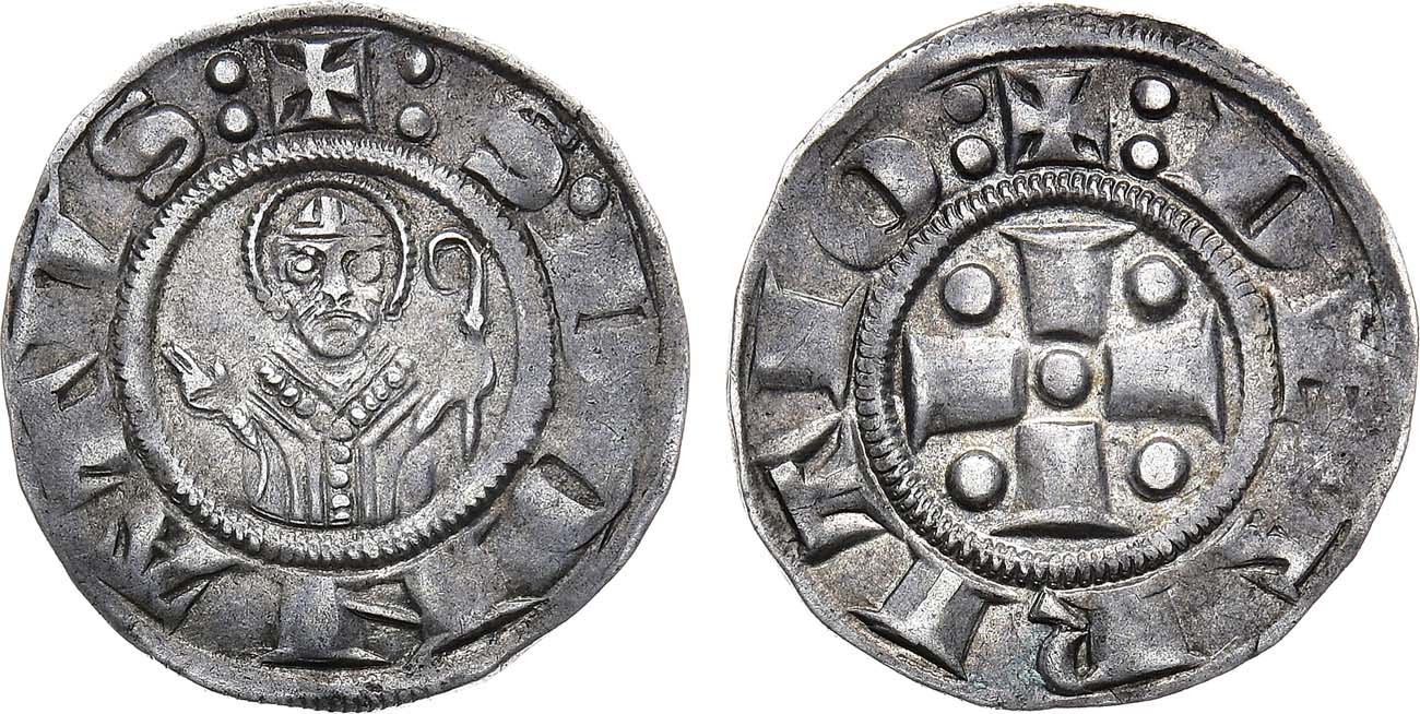 Серебро. 1,41г. Ареццо. Аверс: изображение святого Доната анфас с посохом в левой руке и поднятой вверх правой рукой; круговая легенда "+ S DONATVS". Реверс: изображение креста внутри окружности; круговая легенда "+ DE ARITIO". AU.