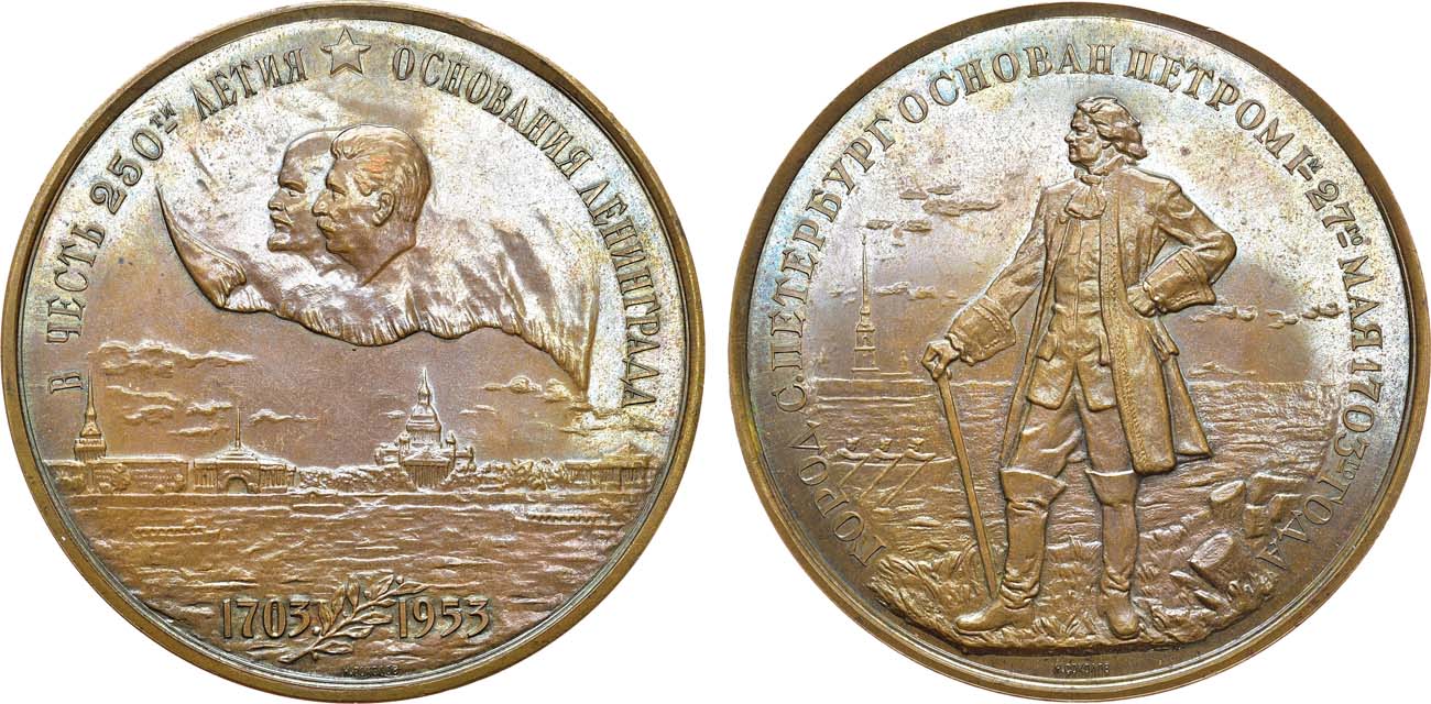Вариант с профилем И.В. Сталина на реверсе. Торжества, посвященные празднованию 250-летия города, который был основан Петром I в 1703 г., состоялись не в 1953 г., а в 1957 г. Ряд исследователей связывают подобный перенос с развернувшимся ранее "Ленинградским делом".