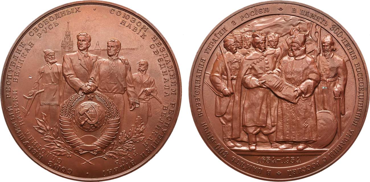 Воссоединение Украины с Россией - традиционное в советской историографии название события, во время которого Запорожское казачье Войско перешло в подданство русского Царя в 1654 г. С просьбой об этом к Алексею Михайловичу обратился гетман Войска Запорожского Богдан Хмельницкий. Законодательно утвердили переход Земский собор в Москве и Рада в Переяславле. Основной причиной явилось стремление украинского населения Речи Посполитой избавиться от религиозного, национального и социального угнетения. Медали такого большого формата (100мм) крайне редко встречается в столь высокой степени сохранности.