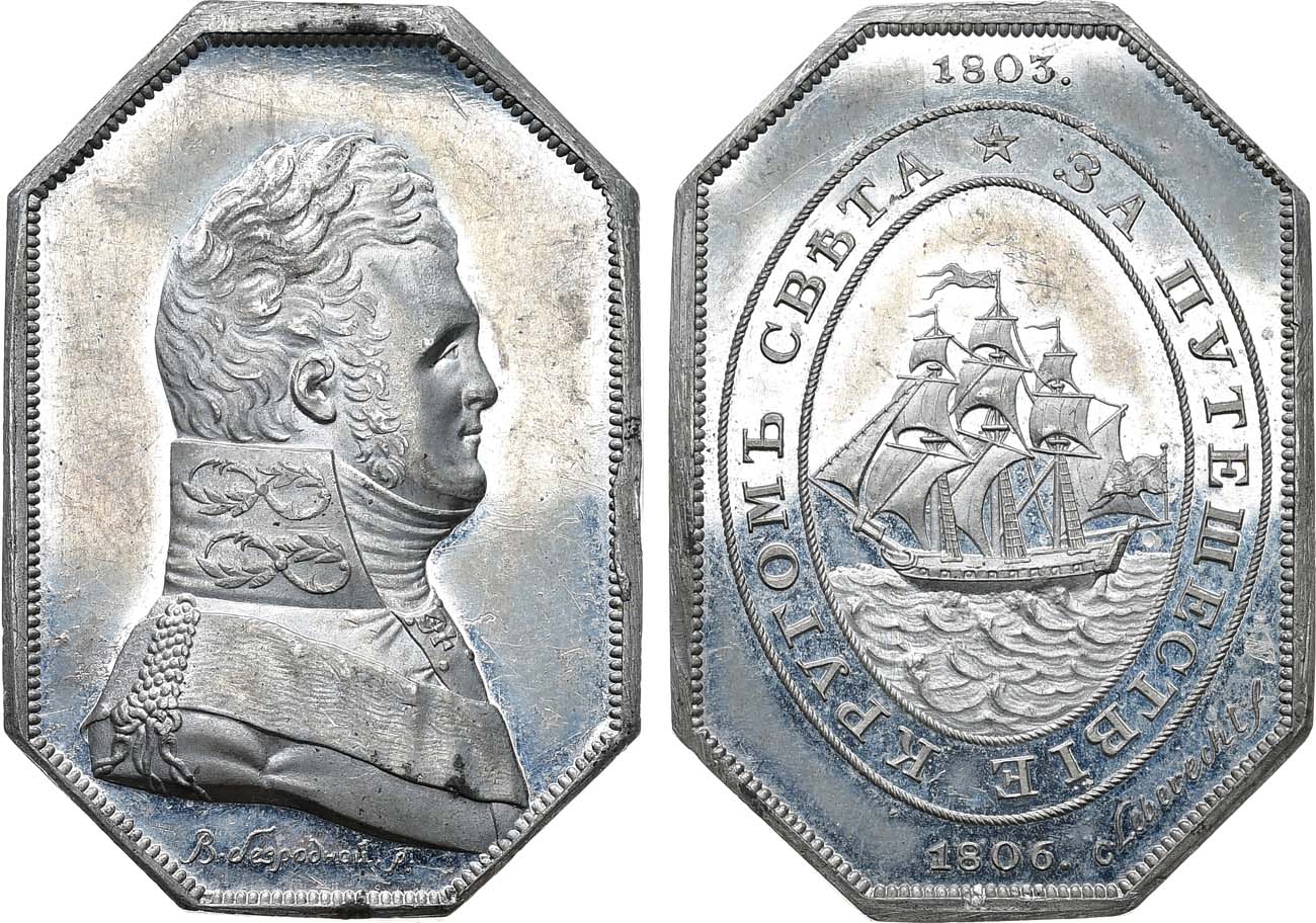 Свинцово-оловянный сплав. 13,48г. Размеры 28х40 мм. Медальер аверса - В. Безродный (на 6 часов "В.безродной.р:"). Медальер реверса - К. Леберехт (на 5 часов "CLeberecht.f"). Аверс: портрет императора Александра I в мундире Преображенского полка - вправо. Реверс: изображение шлюпа "Надежда"; круговая легенда "ЗА ПУТЕШЕСТВIЕ КРУГОМЪ СВѢТА". Смирнов 353. Дьяков 305.1. UNC.