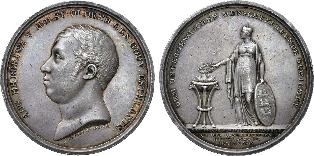 С аукциона WAG #51, Арнсберг, сентябрь 2009 года, лот 1318. Август I - великий герцог Ольденбургский с 1829 года. До этого в течение 18 лет состоял на русской службе в чине генерал-лейтенанта и (с 1823) генерала от инфантерии. В 1811 году, когда Ольденбург оккупировали войска Наполеона, эмигрировал в Российскую империю и принят на службу, назначен шефом 1-го егерского полка и Ревельским (Эстляндским) генерал-губернатором, исполнял данные возложенные на него обязанности до 1816 года.