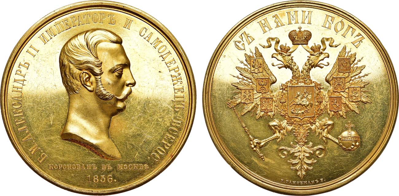 Золото. 105,06г. Диаметр 51,2 мм. Санкт-Петербургский монетный двор. Медальер аверса В.В. Алексеев (на обрезе шеи "В.АЛЕКСѢЕВЪ Р."). Медальер реверса Р.Р. Ганнеман (на 6 часов "Р.ГАННЕМАНЪ Р."). Смирнов 603/б. Дьяков 653.2(R3). AU/UNC.