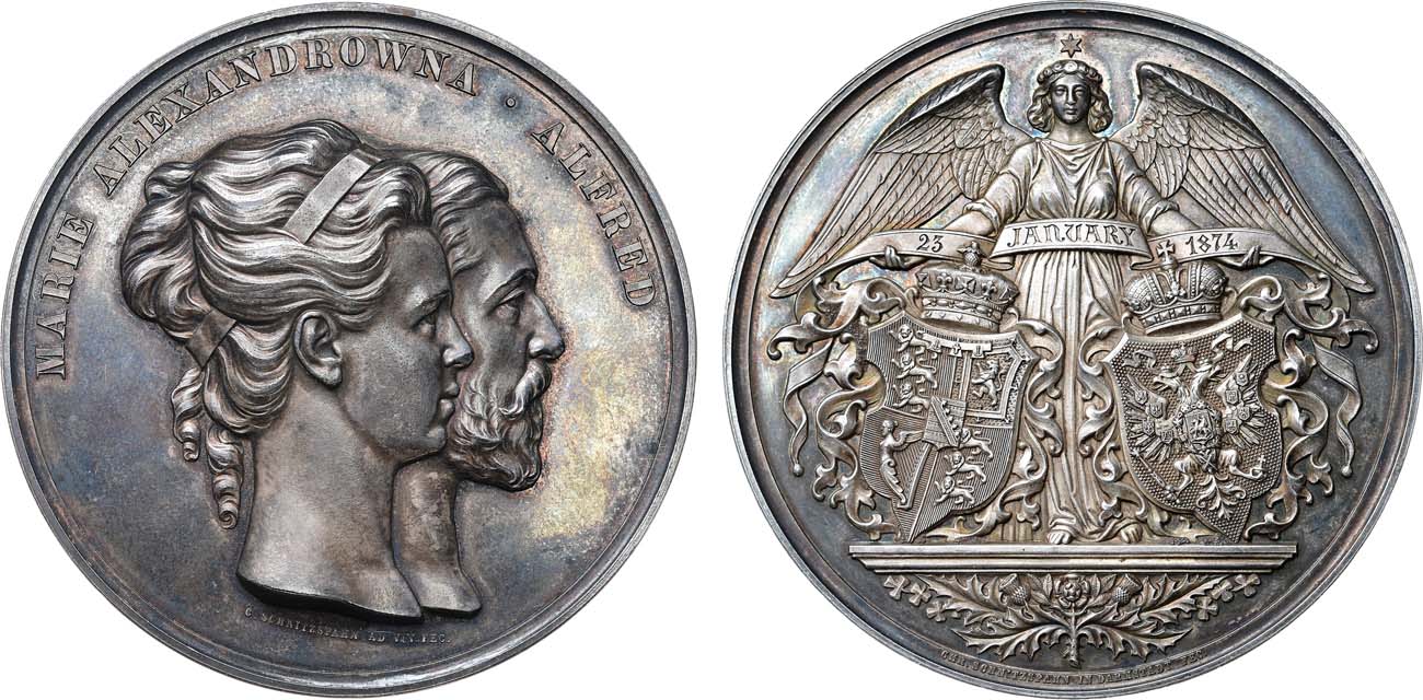 Серебро. 106,71г. Диаметр 63 мм. Медальер К. Шнитцшпан (аверс внизу на фоне под портретами: "C. SCHNITZSPAHN AD VIV.FEC."; реверс внизу по краю: "CHR. SCHNITZSPAHN IN DARMSTADT FEC."). Дьяков 809.1(R3). UNC.