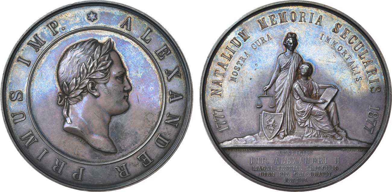 Серебро. 146,34г. Диаметр 69 мм. Гельсингфорсский монетный двор. Медальер К. Ян, реверс по эскизу Я. Аренберга (на аверсе под обрезом "C.JAHN FEC."; на реверсе на 8 часов "J.AHRENBERG INV.", на 4 часа "C.JAHN FEC."). Дьяков 836.1(R3). AU/UNC.