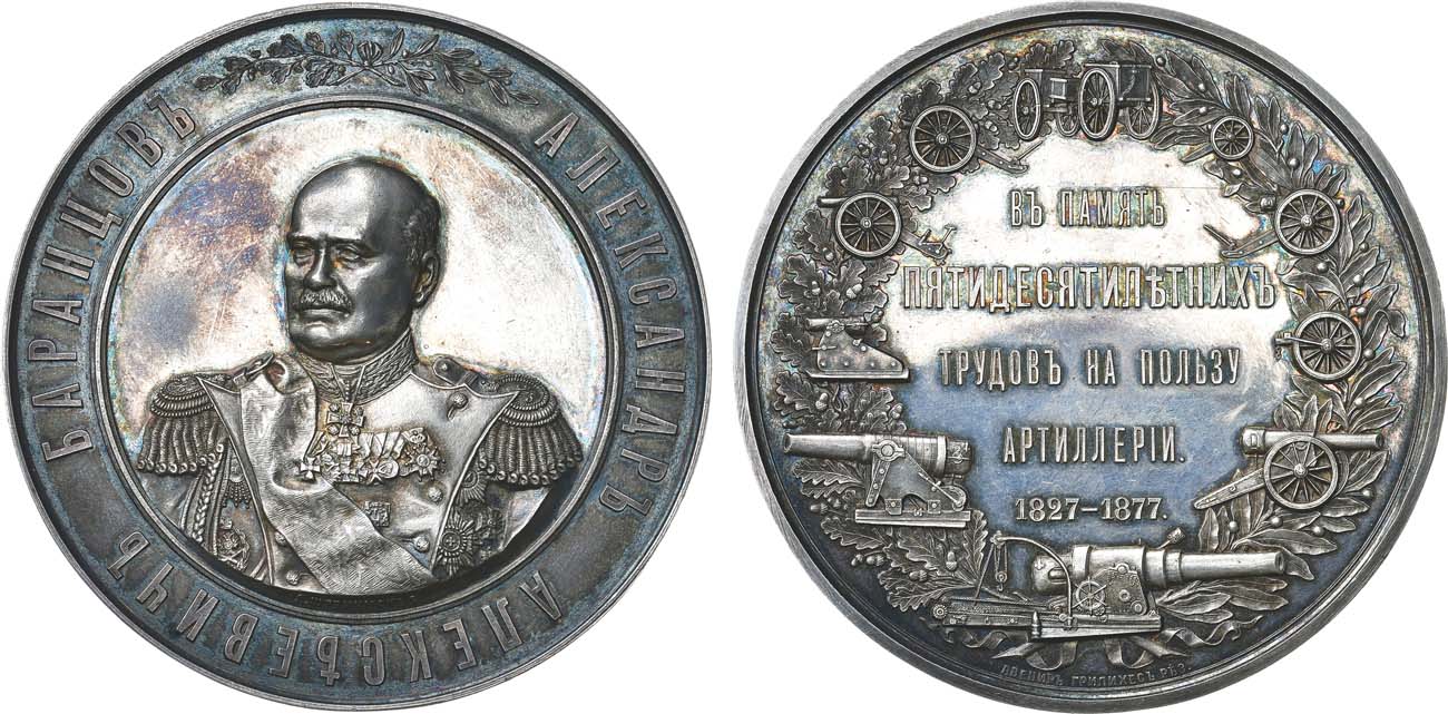 Серебро. 159,52г. Диаметр 72,2 мм. Санкт-Петербургский монетный двор. Медальер аверса Л.Х. Штейнман (на аверсе в обрезе на 6 часов "Л.ШТЕЙНМАНЪ Р."). Медальер реверса А.Г. Грилихес (на реверсе на 6 часов "АВЕНИРЪ ГРИЛИХЕСЪ РѢЗ."). Смирнов 760. Дьяков 837.1(R3). AU/UNC.