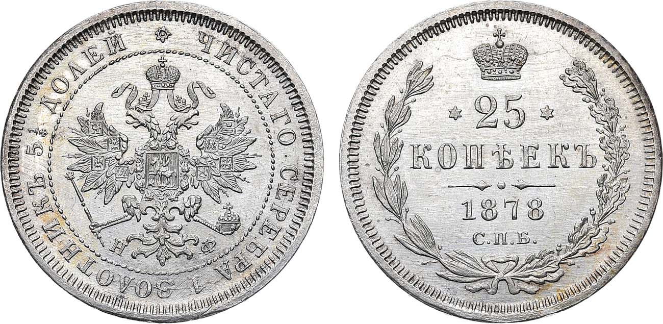 25-копеечники периода правления Императора Александра II с ошибками в легенде встречаются особенно редко и представляют высокий коллекционный интерес.