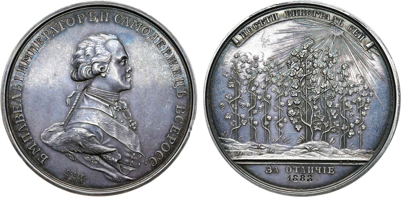 Серебро. 58,76г. Диаметр 51 мм. Санкт-Петербургский монетный двор. Медальер В. Алексеев по оригиналу Леберехта (аверс: под портретом, в 2 строки "C.L.F. | К.В.А. "). Смирнов 329/б. Дьяков 258.3(R2). AU 58.