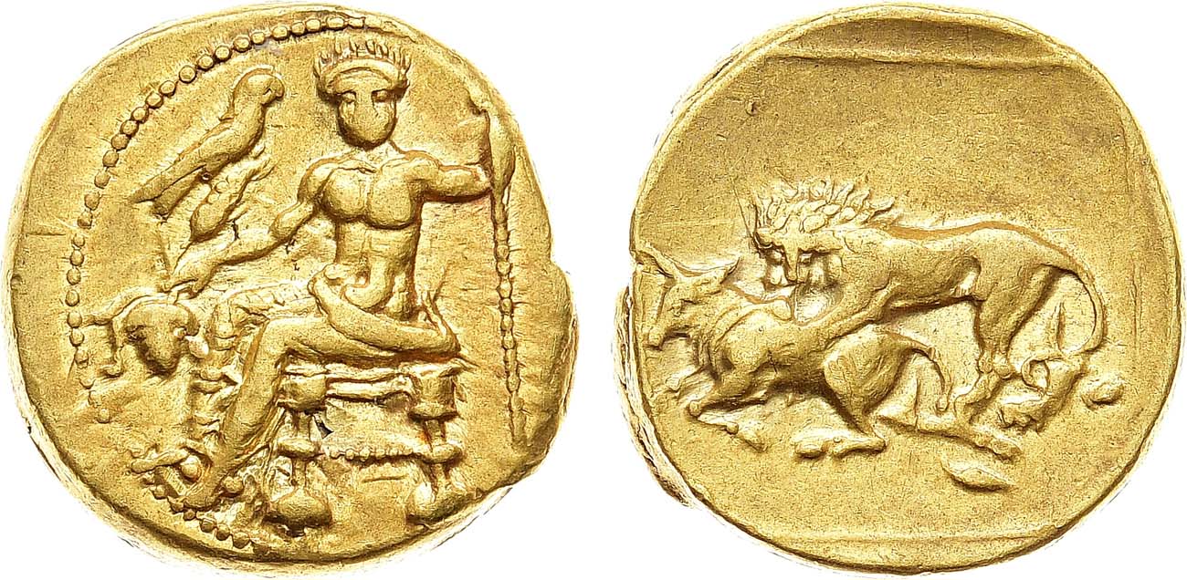 Золото. 17,14г. Тарс. Аверс: изображение Баалтара на троне; с длинным скипетром, колосом пшеницы, виноградной гроздью и орлом. Реверс: изображение льва, схватившего быка. AU.