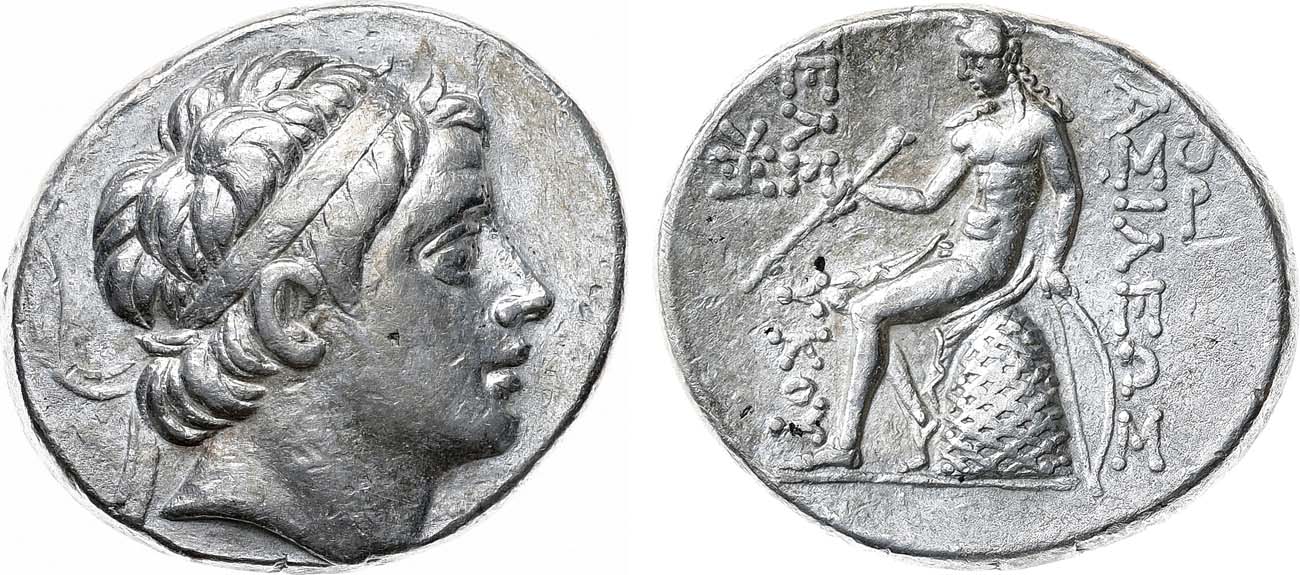Серебро. 16,83г. Антиохия. Аверс: изображение головы Селевка III в диадеме вправо. Реверс: вертикальная легенда "BAΣΙΛΕΩΣ ΣΕΛE — ΥΚοΥ"; изображение Аполлона Дельфийского на омфале. SC 921.1. WSM 1029. XF.