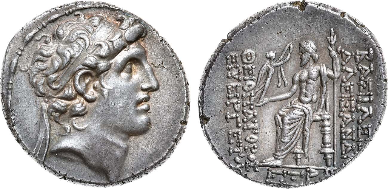 Серебро. 16,61г. Антиохия-на-Оронте. Аверс: изображение головы Диониса - вправо. Реверс: вертикальная легенда "ΒΑΣΙΛΕΩΣ∕ ΑΛΕΞΑΝΔPOY/ ΘΕΟΠΑΤΟΡΟΣ/ EYEPΓETOY"; изображение Зевса на троне с венчающей его богиней Никой в руке. AU.