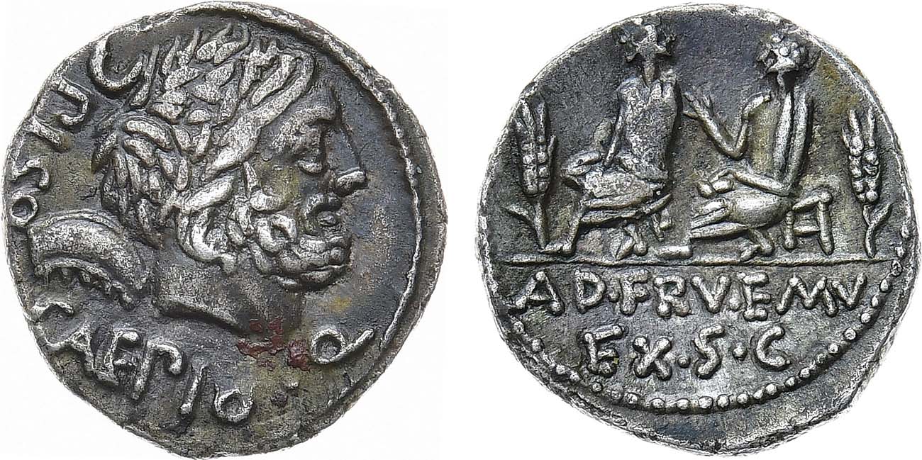 Серебро. 3,1г. Рим. Аверс: легенда "PISO CAEPIO Q"; изображение головы Сатурна в лавровом венке - вправо. Реверс: изображение двух сидящих магистратов в тогах и двух хлебных колосьев по бокам; строчная легенда под обрезом "AD FRV EMV / EX S C". Crawfod 330/1a. Sydenham 603. Babelon Calpurnia 5 and Servilia 12. XF+/AU.
