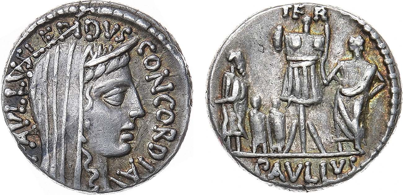 Серебро. 3,86г. Рим. Аверс: круговая легенда "PAVLLVS LEPIDVS-CONCORDIA"; изображение головы Конкордии в диадеме вправо. Реверс: изображение Павла Лепида, устанавливающего трофей перед тремя пленниками (македонским царем Персеем и двумя его сыновьями) в память о победе Павла при Пидне в 168 году до н.э. Внизу, под линией обреза - "PAVLLVS". Crawford 415/1. Sydenham 926.. AU.
