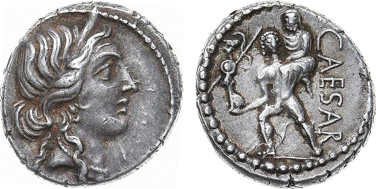 Серебро. 3,94г. Рим. Аверс: изображение головы Венеры в диадеме вправо. Реверс: изображение Энея, несущего Анхиза на плече; вертикальная легенда "CAESAR". Spink 1402. RSC 12. AU.