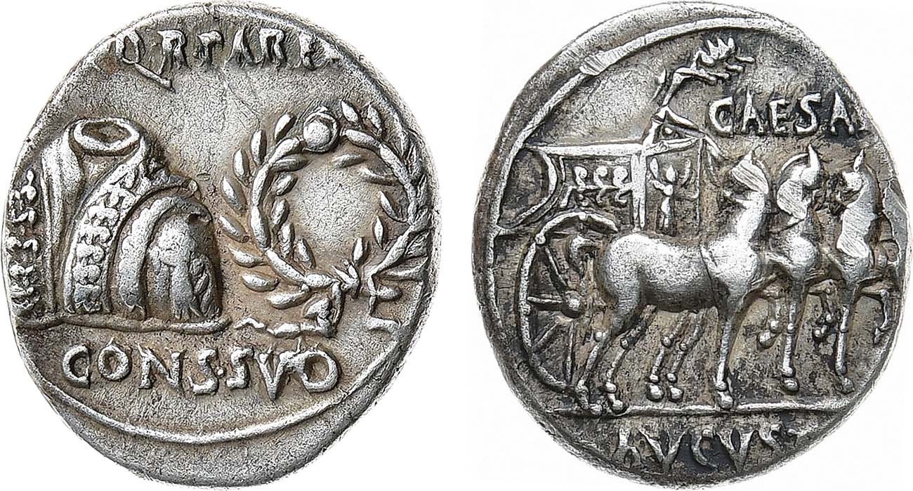 Серебро. 3,8г. Колония Патриция (Кордова). Аверс: изображение аквилы, тоги и лаврового венка; легенда "S·P·Q·R PAREN / CONS·SVO". Реверс: изображение квадриги, украшенной изображением Виктории; легенда "CAESAR / AVGVSTO". AU.
