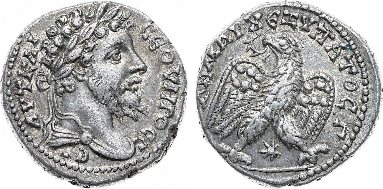 Серебро. 13,68г. Лаодикея Приморская. Аверс: портрет императора в лавровом венке вправо; круговая легенда "AVT КАI CЄOYHPOC CЄ". Реверс: круговая легенда "ДНМАRC ЄX YПATOC Г"; изображение орла, обращённого влево. AU.