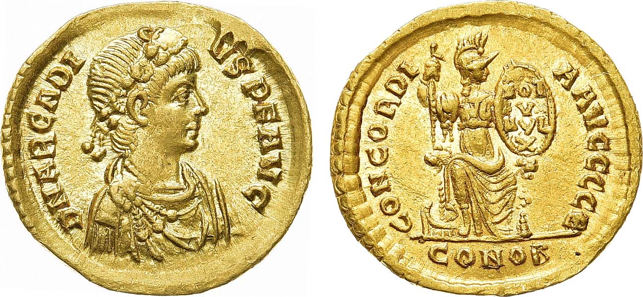 Золото. 4,46г. Константинополь. Аверс: портрет императора в диадеме вправо; круговая легенда " DN ARCADIVS PF AVG". Реверс: круговая легенда "CONCORDIA AVG CCCB"; изображение Конкордии - вправо; под линией обреза "CONOB". Sear 20704. AU/UNC.