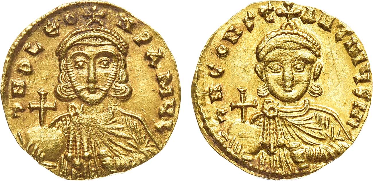 Золото. 4,43г. Константинополь. Аверс: круговая легенда "DNO LEO NP A MЧL"; портрет Льва III анфас с короткой бородой, в короне с крестом, с державой и акакией в руках. Реверс: круговая легенда "DN CONSTANTIN ЧS MI"; портрет безбородого Константина, в короне с крестом, с державой и акакией в руках. Sear 1504. Sommer 21.2. AU/UNC.