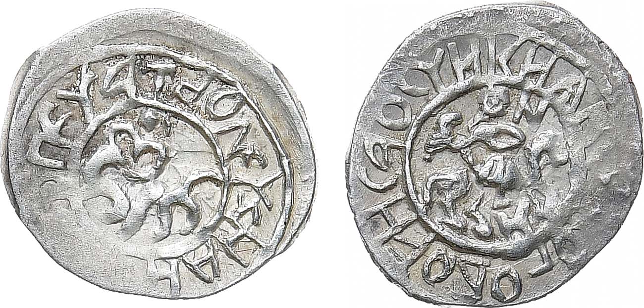 Серебро. 0,56г. Чеканка в Кашине. Аверс: сокольник вправо, "N" перед ним, круговая русская легенда "КИѦ ВЄНКОГО БОРНСА ОЛЄ". Реверс: Самсон, борющийся со львом влево, круговая русская легенда "ПЄYАТЬ ОЛЄYСНАНД". ГП2 7145A (R-III). AU.