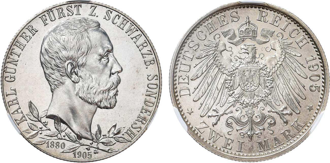 Серебро. Берлин (А). Отчеканена в честь 25-летнего юбилея правления князя Карла Гюнтера. Узкий кант. Тираж: 5 000 экз. KM 153. Jaeger 169a. Weege 160. PF 64.