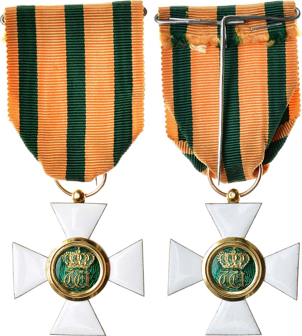 Золото, эмаль. Размеры 35х35 мм. С соединительным кольцом, на зелёно-оранжевой ленте. UNC.
