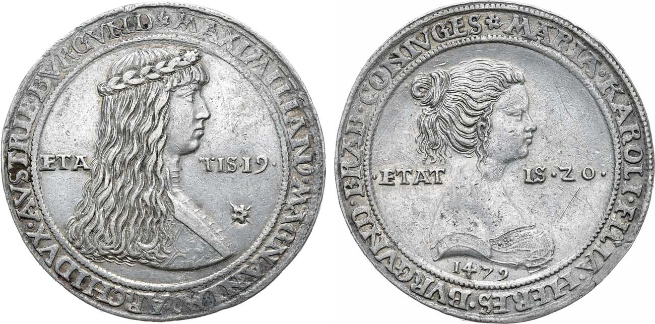 Серебро. 30,56г. Халль. Медальер Ульрих Урсенталер. Аверс: круговая легенда "MAXIMILIAN9 MAGNANIM9 ARCHIDVX AVSTRIE BVRGVND"; портрет Максимилиана I. Реверс: круговая легенда "MARIA KAROLI FILIA HERES BVRGVND BRAB CONIVGES"; портрет Марии Бургундской. Соотношение сторон: 45°. Davenport-не описана. Winter 37a. AU.