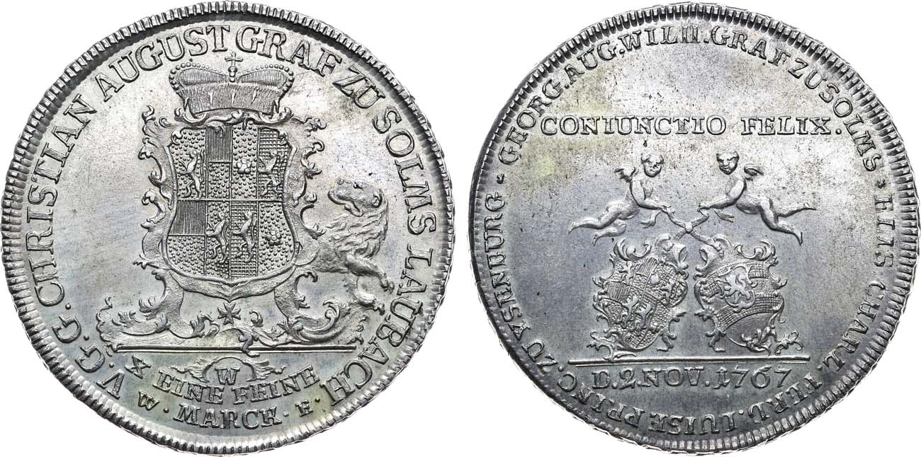 Серебро. 28,12г. Нюрнберг. Отчеканена в память свадьбы сына графа Кристиана Августа, Георга Августа Вильгельма, и Элизабет Шарлотты Фердинанды Луизы, дочери принца Фридриха Эрнста фон Изенбурга. Davenport 2783. Joseph 452. AU 55.