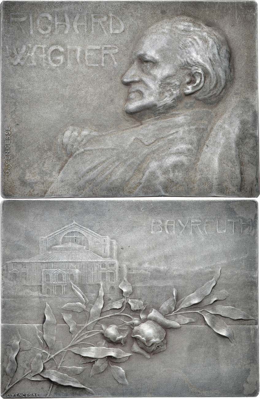 Вильгельм Рихард Вагнер (22 мая 1813, Лейпциг — 13 февраля 1883, Венеция) — немецкий композитор, дирижёр. Крупнейший реформатор оперы, оказавший значительное влияние на европейскую музыкальную культуру, особенно немецкую, в особенности на развитие оперных и симфонических жанров. Вагнер построил свой оперный театр в Байройте. Здесь состоялась премьера «Кольца» и «Парсифаля», а его самые значительные сценические произведения продолжают исполняться на ежегодном Байройтском фестивале. Изображение этого театра помещено на реверсе представленной плакеты. Похоронен в Байройте.