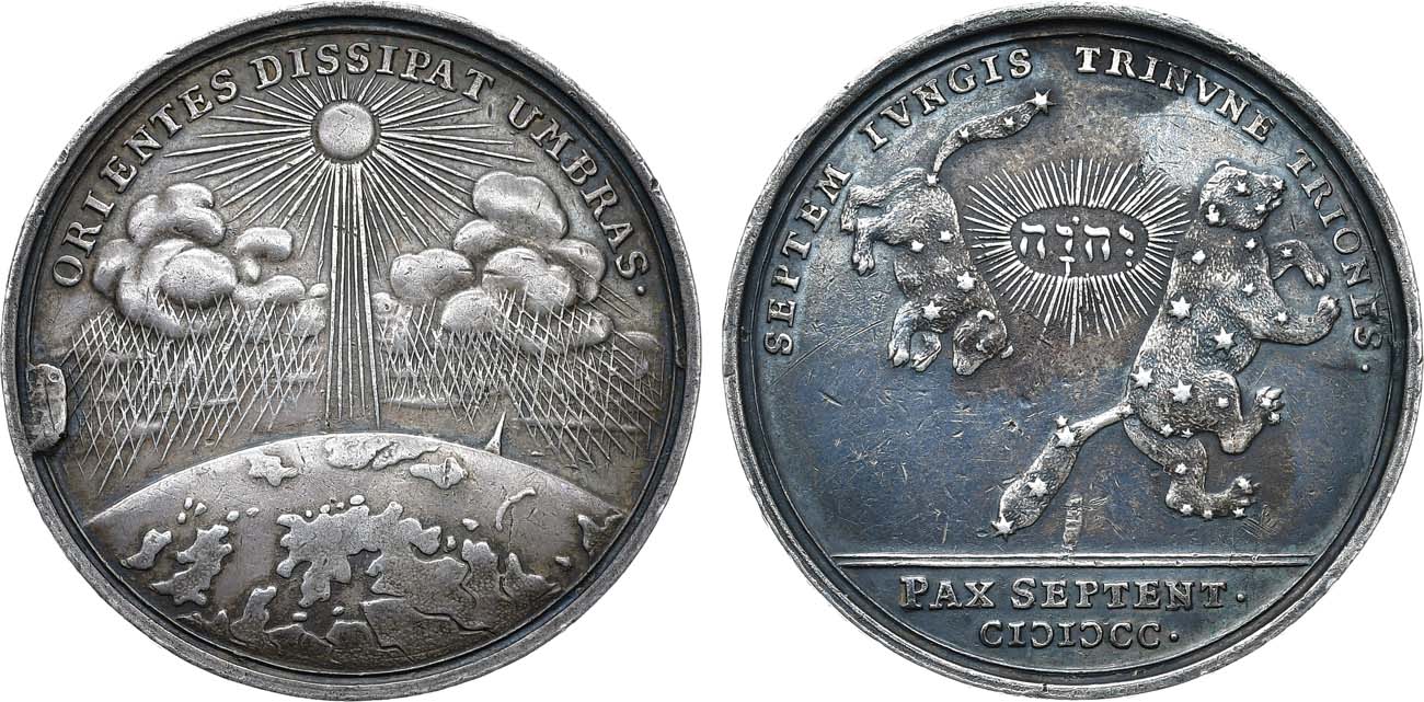 Серебро. 18г. Диаметр: 37 мм. Медальер И.Р. Энгельгардт (без подписи). Аверс: круговая легенда "ORIENTES DISSIPAT UMBRAS". Реверс: круговая легенда "SEPTEM IVNGIS TRINVNE TRIONES./PAX SEPTENT./CICICCC". Гуртовая надпись. Hildebrand 36. AU.
