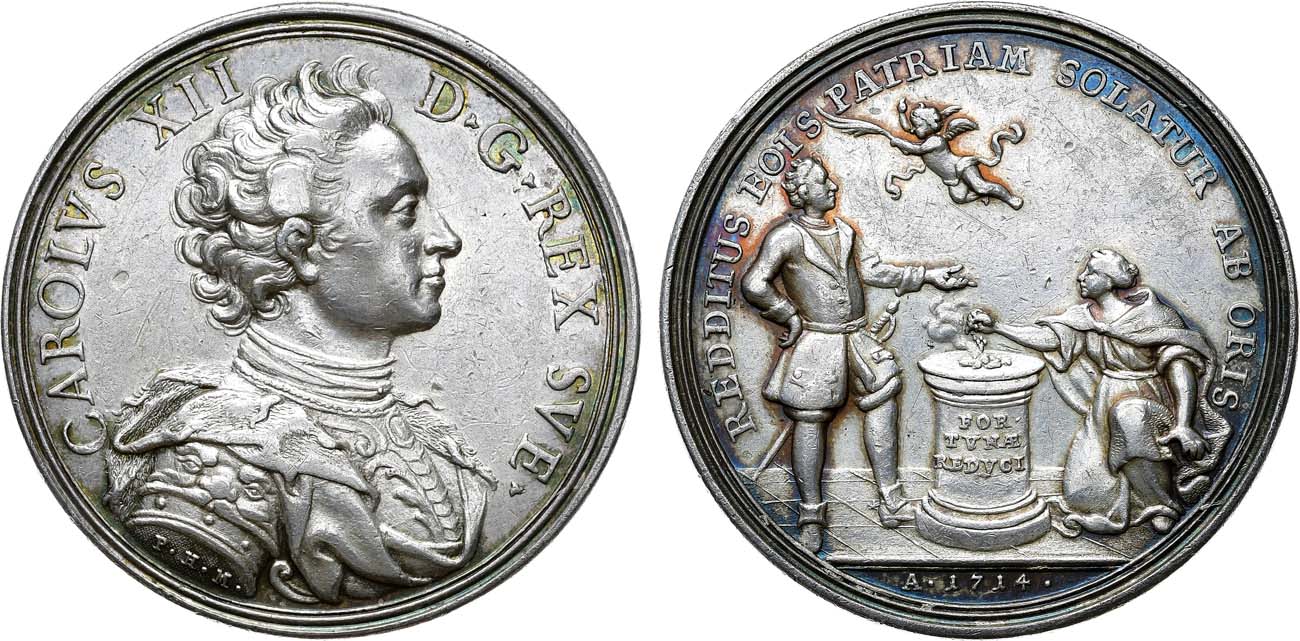 Серебро. 30,24г. Стокгольм. Диаметр 44 мм. Медальер Филипп Генрих Мюллер (на аверсе в обрезе рукава "P•H•M"). Аверс: портрет Карла XII в драпировке и кирасе. Реверс: ростовое изображение короля перед Гестией, богиней домашнего очага, которая преклоняет колени перед зажжённым алтарём и совершает жертвоприношение; вверху изображён летящий ангел, благословляющий Карла пальмовой ветвью. Forster 793. Hildebrand 170. AU.