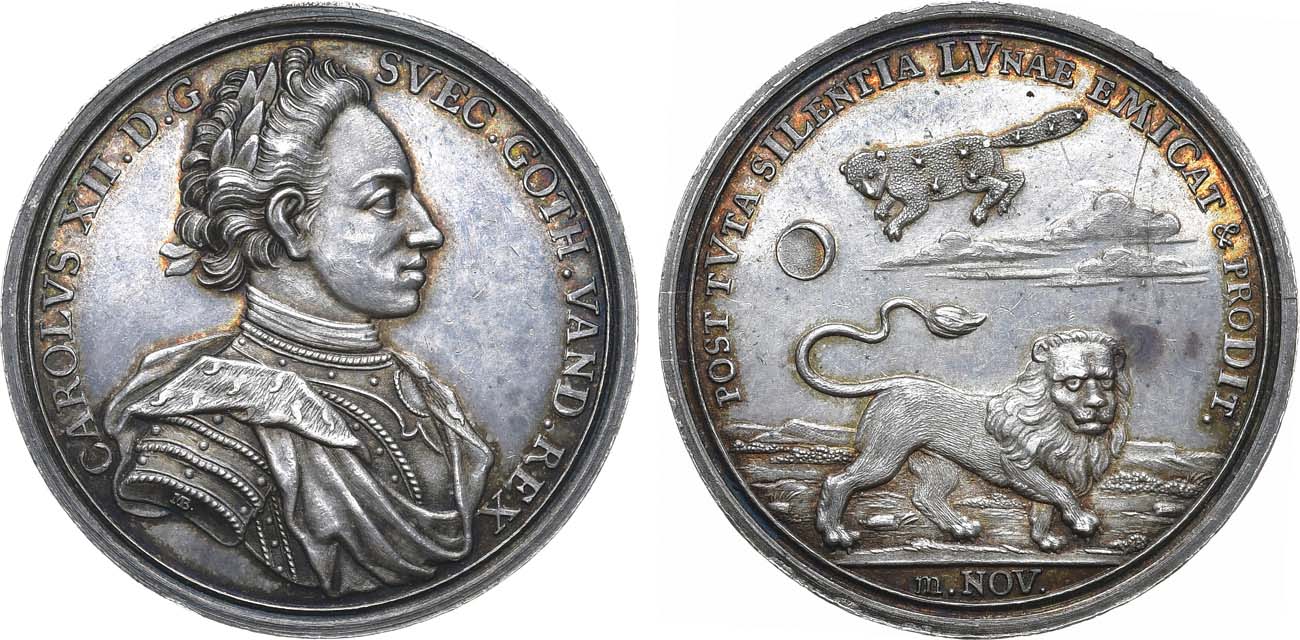Серебро. 14,93г. Диаметр 35 мм. Нюрнберг. Медальер М. Бруннер (на аверсе в обрезе рельефа рукава "МВ"). Аверс: "CAROLVS XII D G - SVEC GOTH VAND REX" поясной портрет короля в военных доспехах вправо. Реверс: Лев, шагающий вправо на фоне пейзажа, над восходящей луной и изображением созвездия Большой Медведицы "POST TVTA SILENTIA LVNAE EMICAT & PRODIT". Hildebrand 169. AU 58.