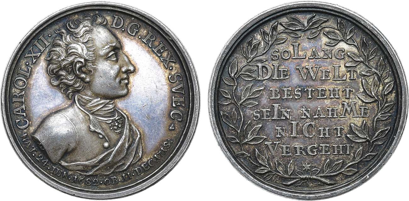 Серебро. 14,52г. Диаметр 32 мм. Медальер Кристиан Вермут (на аверсе в обрезе рукава "W"). Аверс: портрет Карла XII; круговая легенда "CAROL. XII. D. G. REX. SVEC" - "NAT. 24. IUN. 1682. OB. 11. DEC. 1718:". Реверс: строчная легенда внутри лаврового венка "SO LANG DIE WELT BESTEHT SEIN NAHME NICHT VERGEHT" ("Пока существует мир, его имя не будет забыто"). Hildebrand 221. AU/UNC.