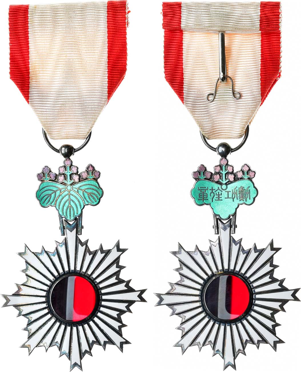 Серебро, эмаль. Размеры 66х46 мм. С соединительным кольцом, на бело-красной муаровой ленте. AU.