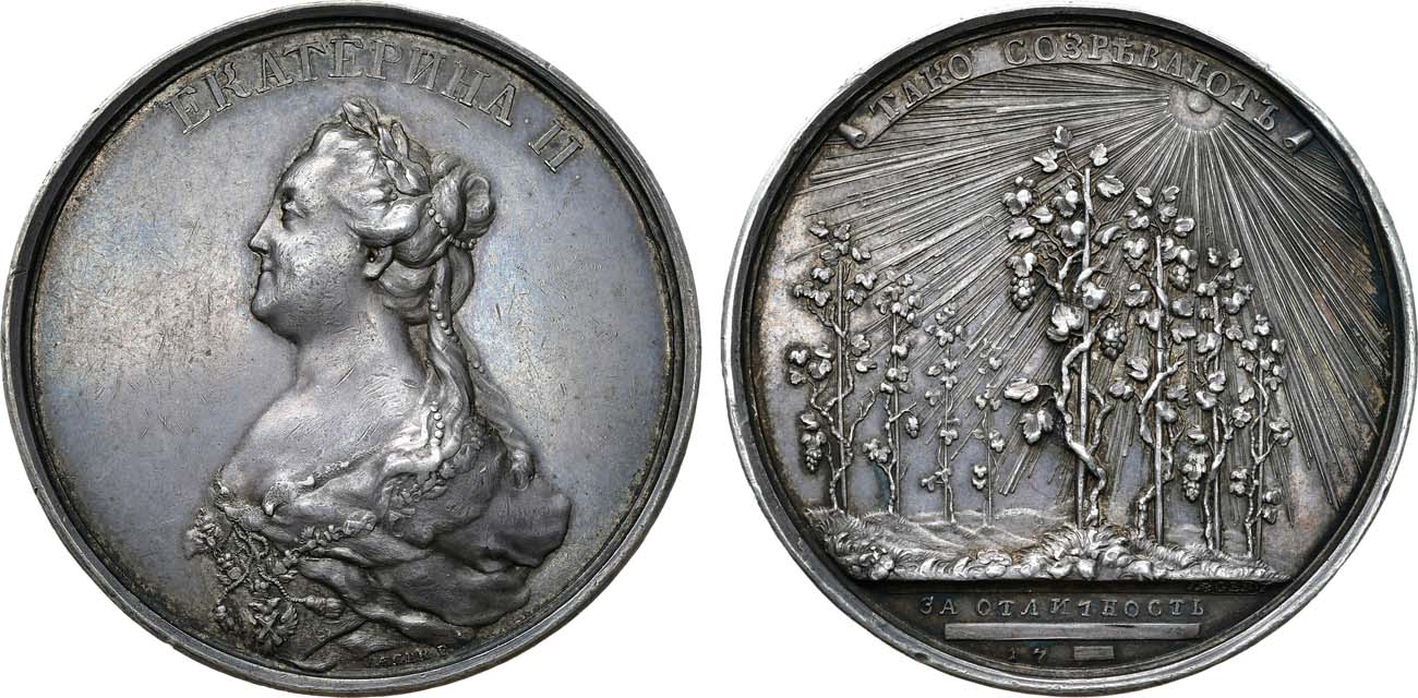 Серебро. 78,8г. Диаметр 54 мм. Санкт-Петербургский монетный двор, 1770-е гг. Медальер И.К. Егер (в нижней части аверса "IAEGER•F•"; реверс: справа на линии обреза - "IAEGER•F•"). Без двух последних цифр в обозначении даты. Смирнов 255. Дьяков 130.1(R3). AU.