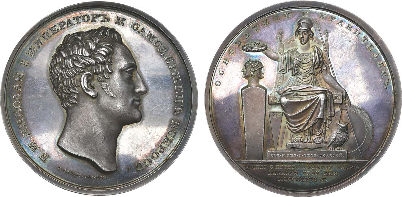 Серебро. 142,11г. Диаметр 65,8 мм. Санкт-Петербургский монетный двор. Медальер граф Федор Толстой. Аверс: под обрезом шеи на фоне "Г. ФЕОДОР. ТОЛСТОЙ.". Реверс: по центру над обрезом "СОЧ. и РЕЗ. Г. ФЕОД. ТОЛСТОЙ.". Смирнов подобен 431. Дьяков 447.1(R2). AU/UNC.
