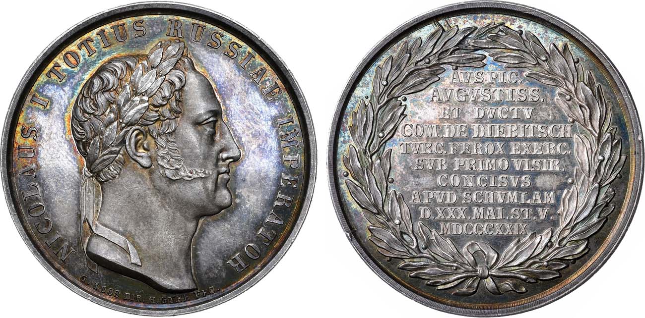 Серебро. 20,93г. Диаметр 39 мм. Пруссия, Берлин, 1830-е гг. Медальерная мастерская Лооса (аверс — под обрезом изображения: "G.LOOS DIR."). Медальеры: аверс — Г.Губе (под портретом "H. GUBE FEC.", реверс — К.К. Пфойффер (без подписи). Из серии медалей на события Русско-Турецкой войны. Дьяков 486.1(R1). AU 58.