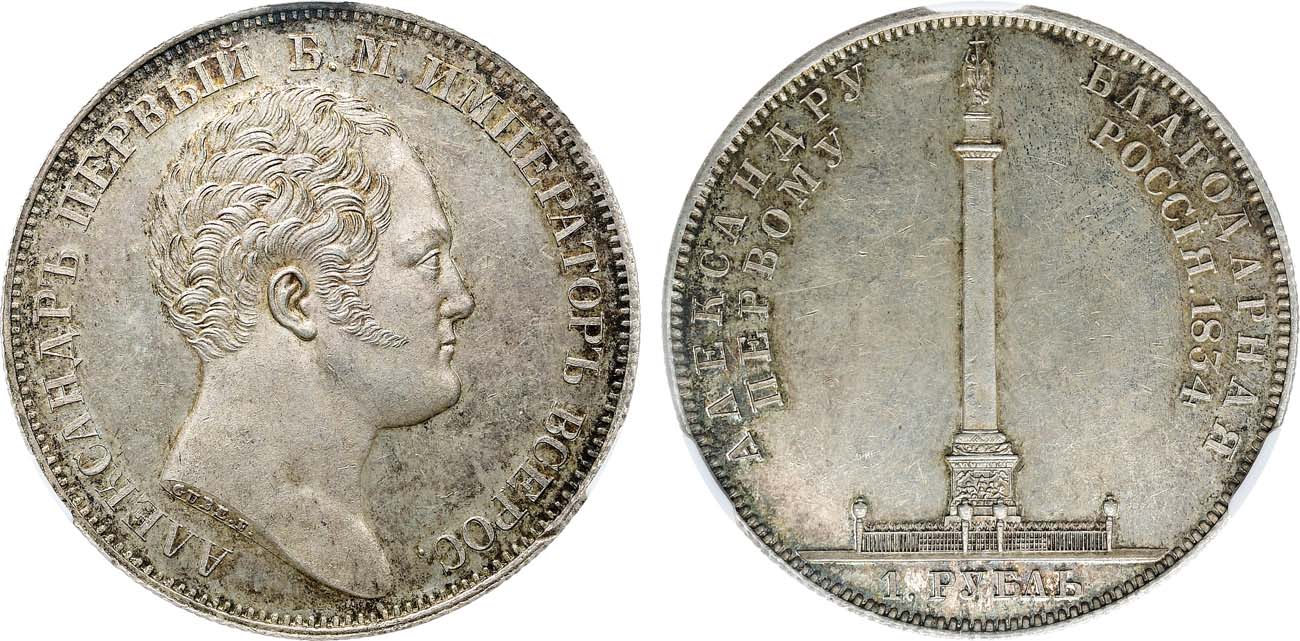 Серебро. Чеканен по случаю открытия Александровской колонны в Санкт-Петербурге. В обрезе шеи "GUBE F." Уздеников 4183. Биткин 894(R). 1 рубль 75 копеек по Петрову. MS 62.