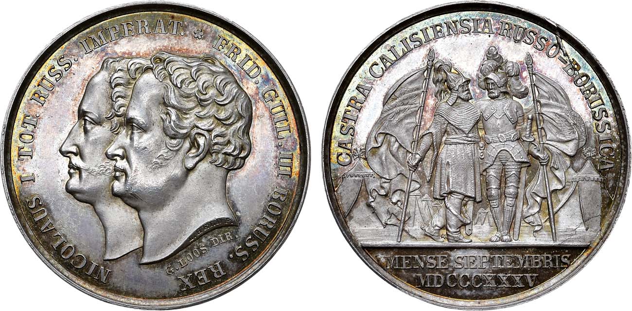 Серебро. 10,94г. Диаметр 33 мм. Пруссия, Берлин. Медальерная мастерская Д. Лооса. Медальер А.Л. Гельд. Аверс: на обрезе шеи короля Фридриха Вильгельма III "L.HELD F."; под изображением "G.LOOS DIR.". Реверс: слева на обрезе "L. HELD F.". Дьяков 524.1(R1). UNC.