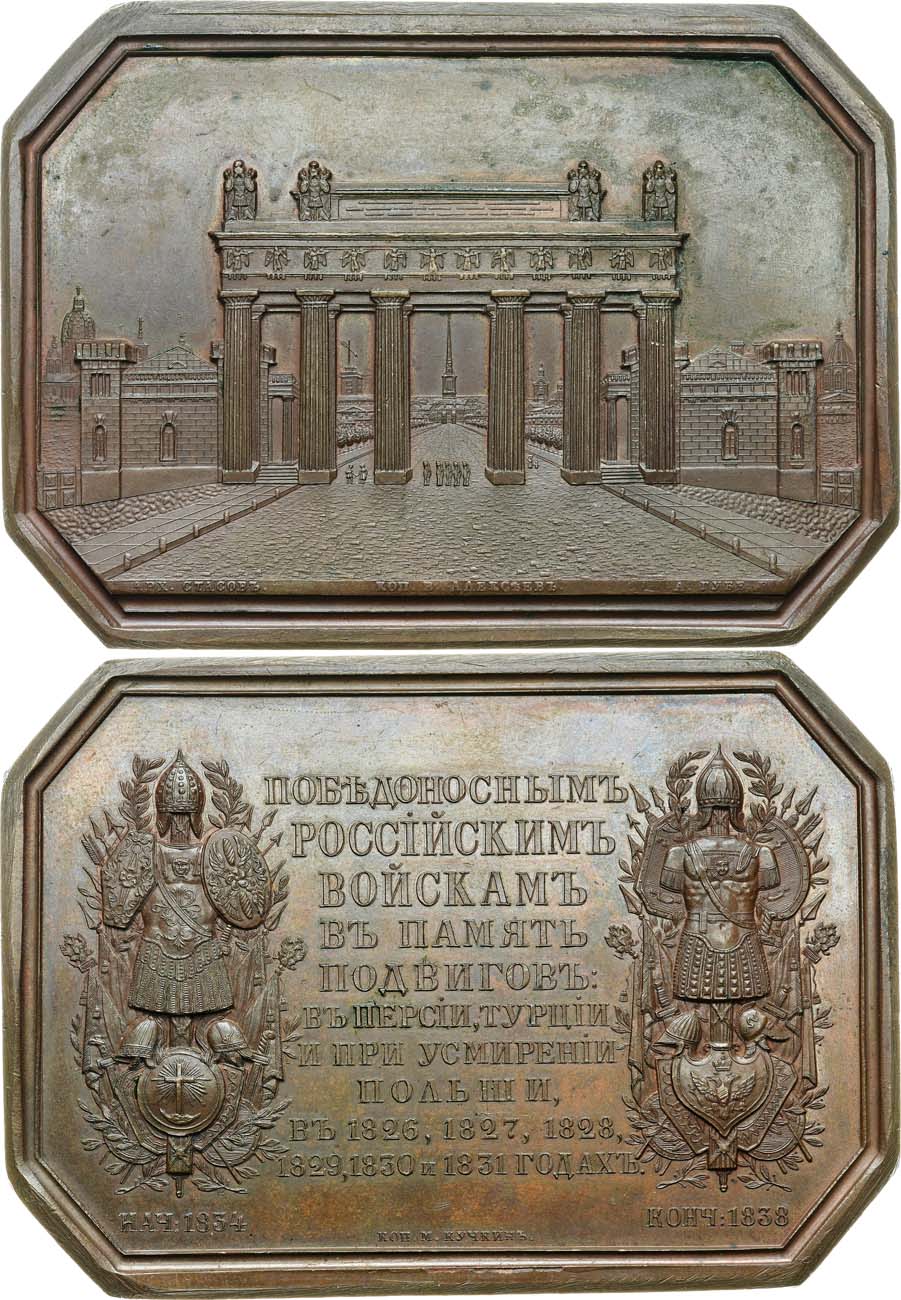После победоносных войн с Персией в 1826-1828 годах и с Турцией в 1828-1829 годах, подавления польского восстания в 1830-1831 годах, Николай I отдал приказ об установке триумфальных ворот на въезде в Санкт-Петербург по московской дороге и лично составил посвятительную надпись на воротах «Победоносным Российским войскам в память подвигов в Персии, Турции и при усмирении Польши в 1826, 1827, 1828, 1829, 1830, 1831 годах». Московские ворота заложили 14 сентября 1834 года и торжественно открыли 16 октября 1838 года. На церемонии открытия, отличившиеся в Турецкой, Персидской и Польских компаниях генералы и офицеры были награждены золотыми, серебряными и бронзовыми плакетами, выбитыми в ознаменование создания ворот.
