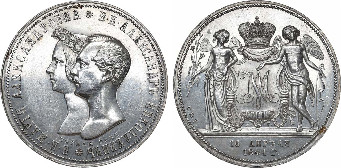 Серебро. 20,76г. Отчеканен по случаю бракосочетания Великого Князя Александра Николаевича, будущего Императора Александра II, и Великой Княжны Марии Александровны. Аверс: "РѢЗАЛЪ ГУБЕ". Реверс: инициалы минцмейстера "НГ". Уздеников 4186(•). Биткин 898(R1). 3 рубля 50 копеек по Петрову. 3 рубля по Ильину. UNC.