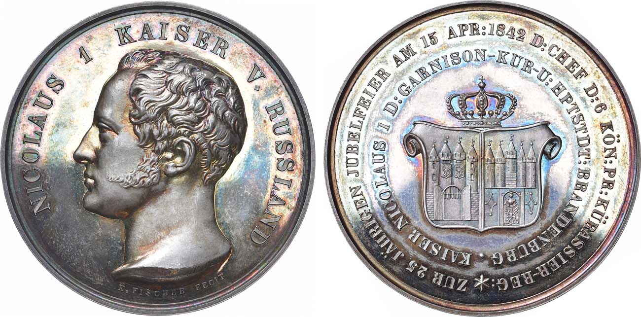 Серебро. 29,22г. Диаметр: 42,5 мм. Пруссия, Берлинский королевский монетный двор, 1842 год. Медальер И.К. Фишер (на аверсе, в обрезе рельефа шеи "КF.FEC.", на 6 часов "K.FISCHER FECIT"). Дьяков 566.1(R3). MS 64.