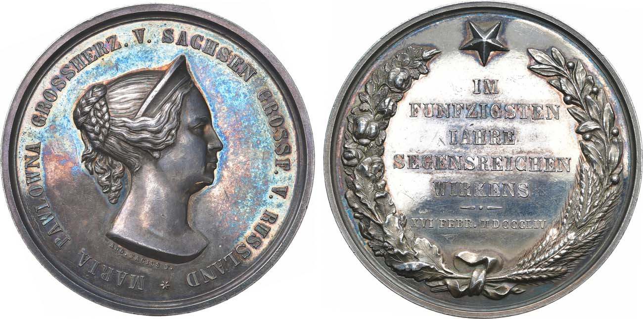 Серебро. 73,04г. Диаметр 56 мм. Германия, Веймар. Медальер Анжелика Фациус (на аверсе под изображением "ANG.FACIUS F."). Надпись на реверсе: «IM / FUNFZIGSTEN / IAHRE / SEGENSREICHEN / WIRKENS / XVI FEBR. MDCCCLIV» (На пятидесятилетие полезной деятельности. 16 февраля 1854 г.). Дьяков 611.1(R2). AU.