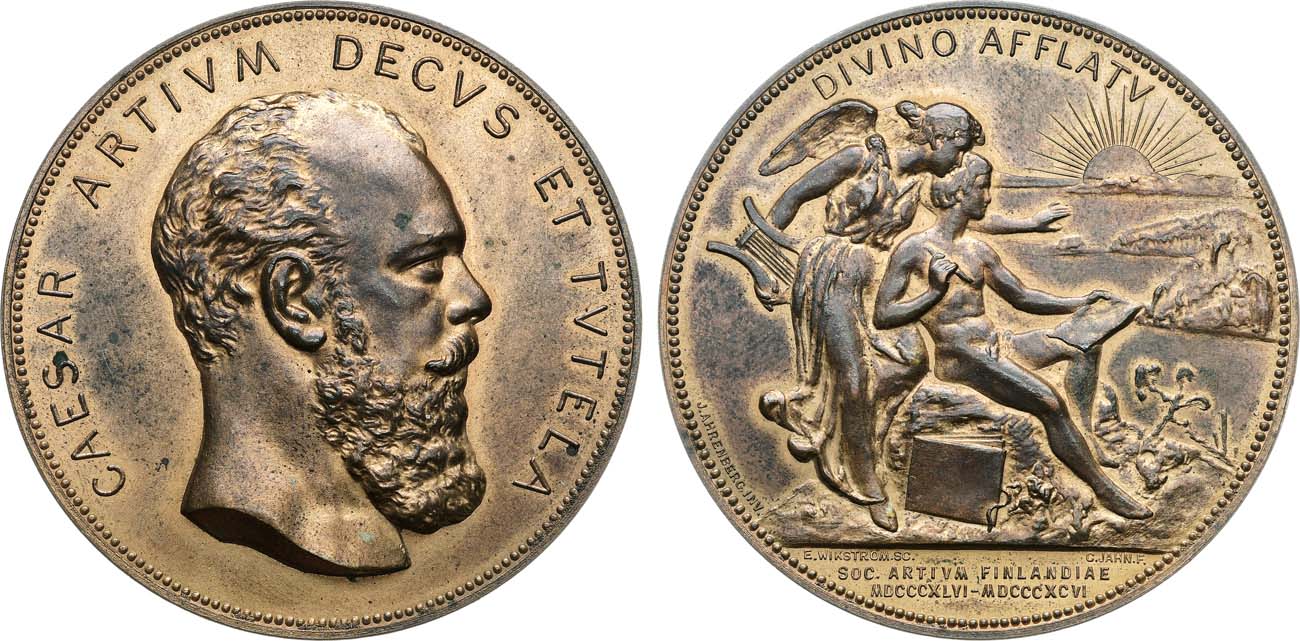 Бронза, золочение. 55,15г. Диаметр 47 мм. Гельсингфорсский монетный двор. Реверс: медальеры Э.Э. Викстрём и К.Э.А. Ян по эскизу Я. Аренберга (под обрезом, слева "E.WIKSTROM.SC.", справа "C.JAHN.F."; слева внизу у окружности "J.AHRENBERG.INV.") Дьяков 1234.1(R0). MS 64.