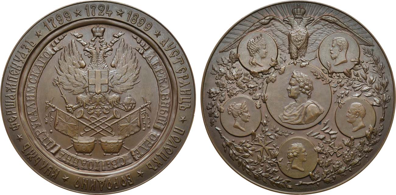 Бронза. 236,97г. Диаметр 79 мм. Санкт-Петербургский монетный двор. Медальер Н.А. Дмитриев (аверс — внизу на поле: "Н.ДМИТРIЕВЪ"). Смирнов 1154. Дьяков 1292.1(R1). UNC.