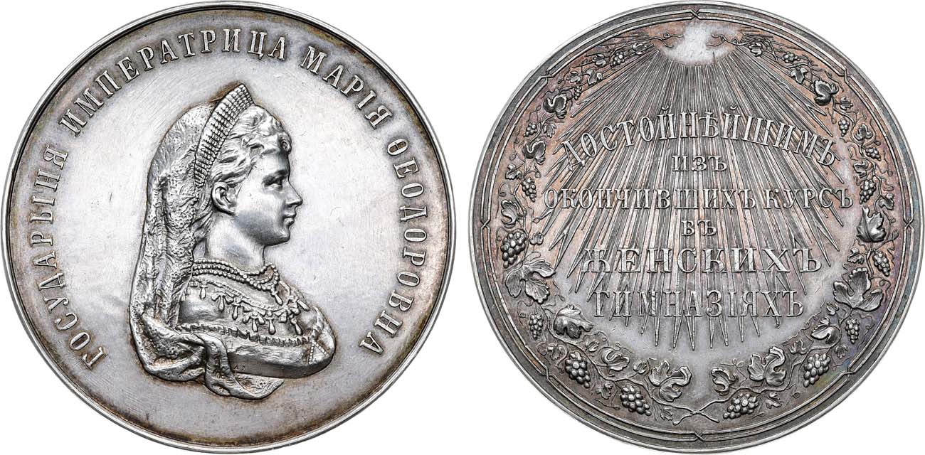 Серебро. 47,91г. Диаметр 45 мм. Санкт-Петербургский монетный двор, начало XX в. Медальер А. Грилихес (на аверсе в обрезе изображения императрицы "А.Г."). Смирнов 1266. Дьяков 909.1А(R3). AU.