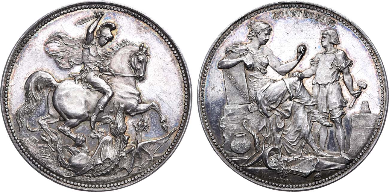 Штемпели медали были изготовлены в 1887 году крупнейшим австрийским медальером второй половины XIX века Антоном Шарффом (1845–1903) и принадлежали Великому Князю Георгию Михайловичу. Медали изготавливались исключительно по заказам Великого Князя Георгия Михайловича. Вручались посетителям, осмотревшим его коллекцию с 1887 по 1909 год. В 1909 году Великий Князь подарил своё богатейшее собрание русских монет Русскому музею в Санкт-Петербурге, открытие которого было также его заслугой. С аукциона Numismatica Genevensis V, Женева, декабрь 2008 года, лот 1241. На аукционе была продана за 14.000 CHF.
