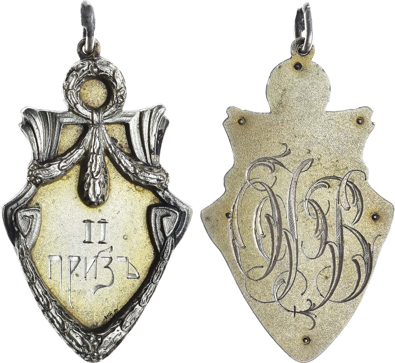 Серебро, золочение. 10,11г. Размеры 26х44 мм. Гравировка на аверсе "II/ ПРИЗЪ", на реверсе "ОФВ". Российская Империя, неизвестная мастерская, 1910-ее гг. UNC.