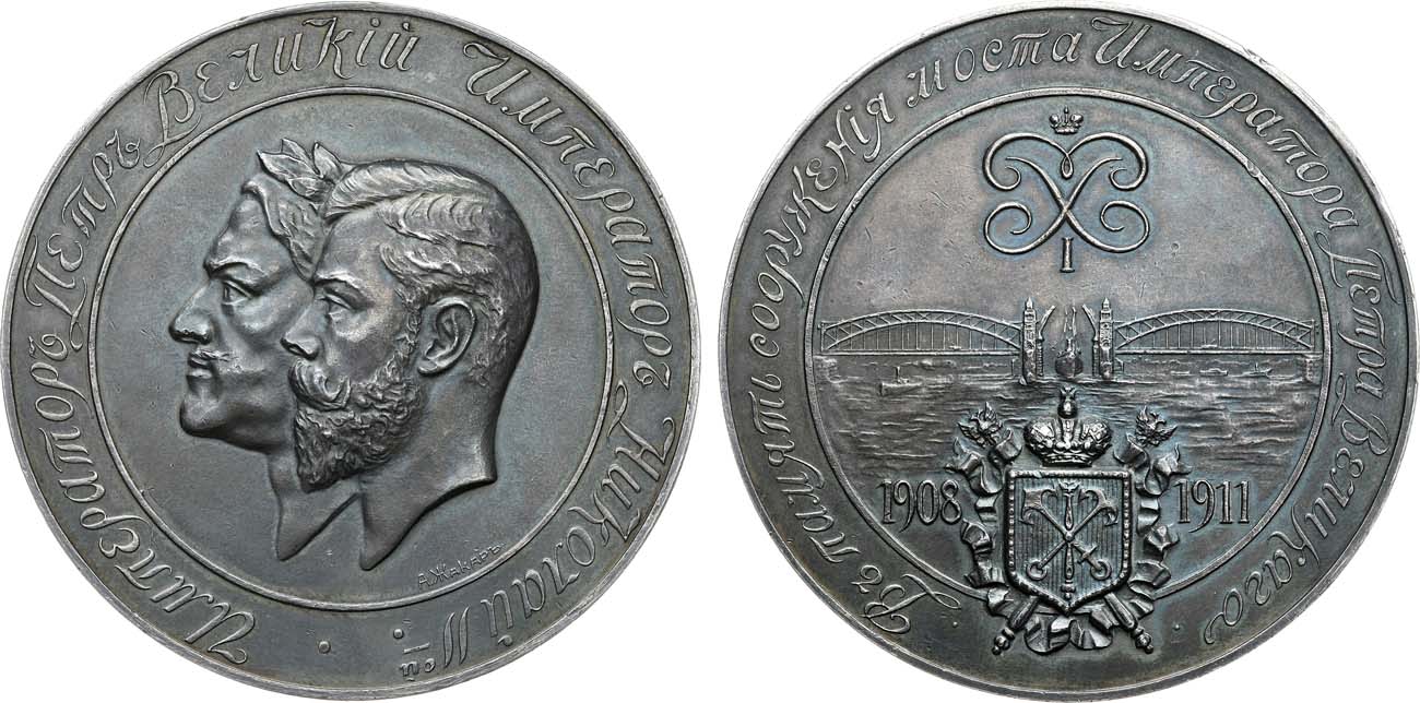 Серебро. 132,06г. Диаметр 62,8 мм. Санкт-Петербург, 1911 г. Мастерская (ателье) А.Ф. Жакара (на аверсе под изображением Николая II, у окружности: "А.Жаkаръ."). По модели Жоржа Монтандона (Франция). Тираж: 500 экз. Дьяков 1515.1(R3). AU/UNC.