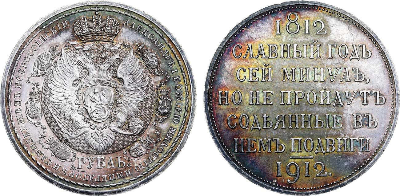 Серебро. 19,91г. Чеканен в честь столетия победы в Отечественной войне 1812 года. Уздеников 4193(•). Биткин 334. Казаков 429(R1). MS 63.