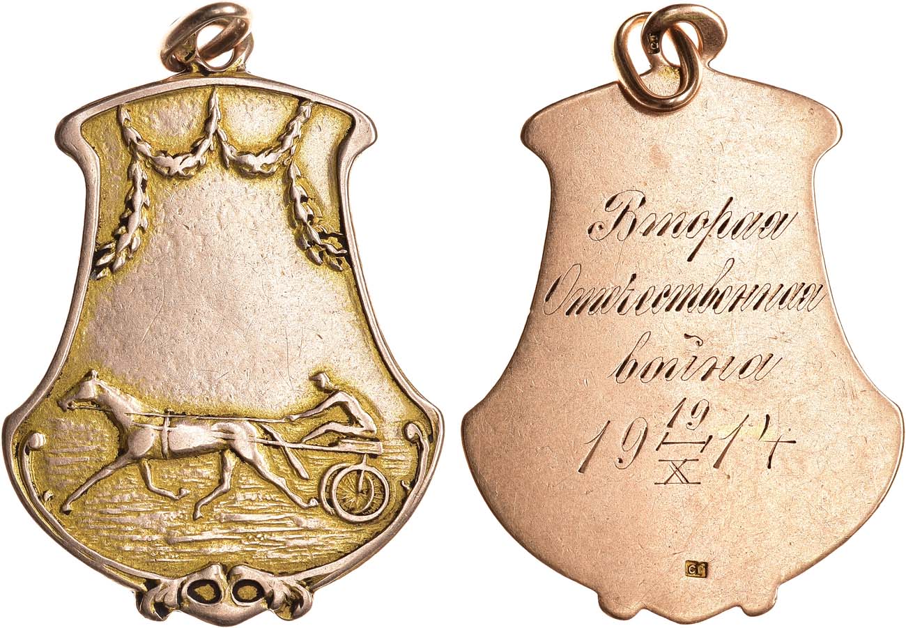 Золото. 9,35г. Размеры 40,6х29 мм. Российская Империя, Москва, 1914 год. Клейма: 1. Московского окружного пробирного управления («дельта», женская голова в кокошнике вправо, «56») – на аверсе ушка. 2. Фирменное клеймо «СП» на реверсе ушка и в нижней части реверса жетона. На реверсе выгравирована надпись в 4 строки: «Вторая / Отечественная / война / 19.X.1914». AU.