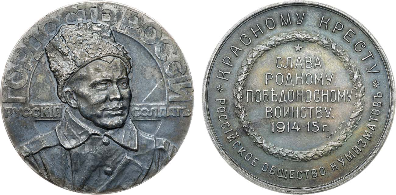 Серебро. 27,69г. Из серии медалей Российского Общества нумизматов в память Первой мировой войны 1914–1918 гг. Диаметр 39,6 мм. Петроград, Мастерская (ателье) А.Ф. Жакара (на реверсе внизу справа внутри венка по окружности "А Жаkаръ"). Медальер Г.И. Малышев (без подписи). Дьяков 1585.3(R3). UNC.